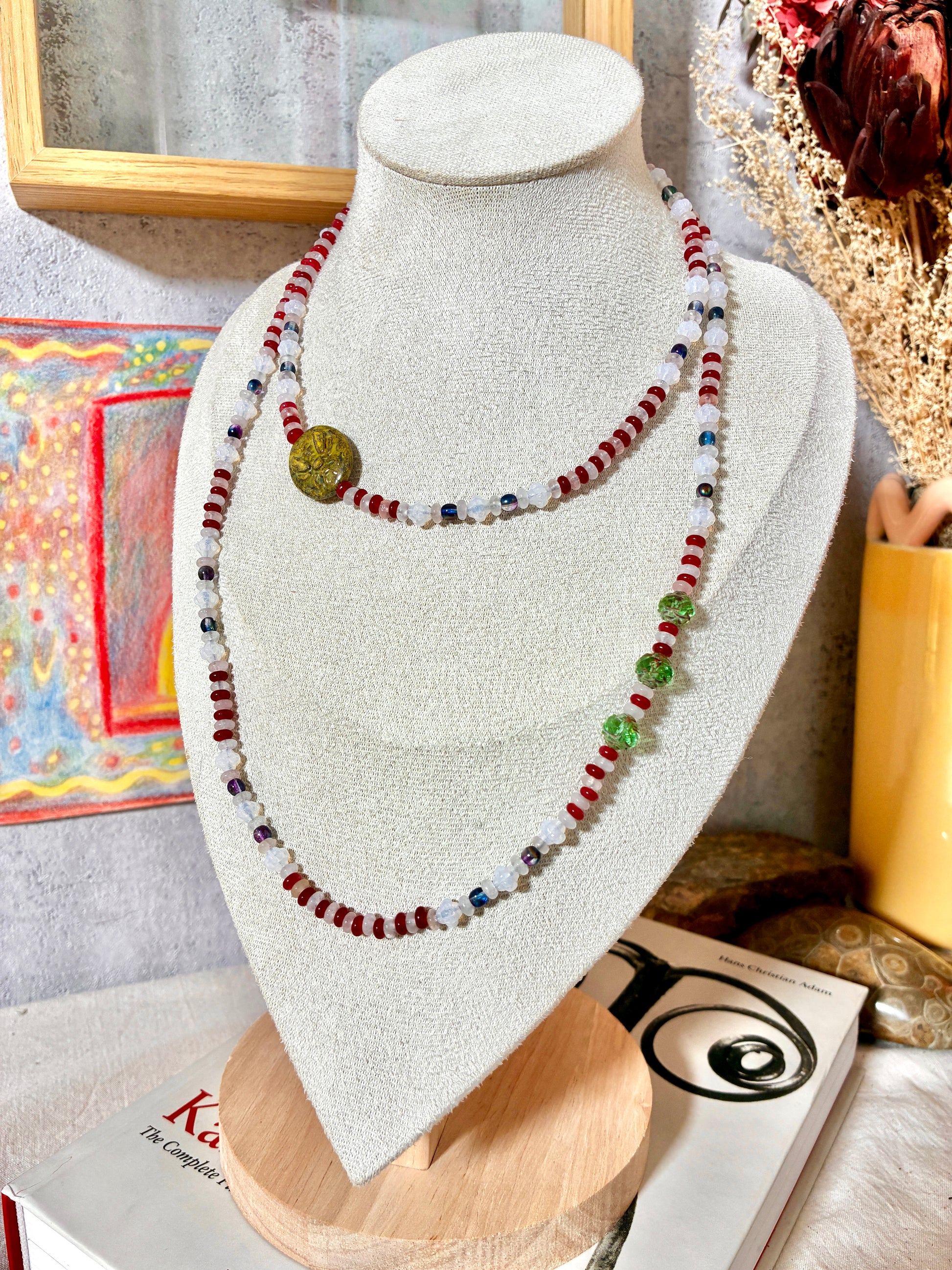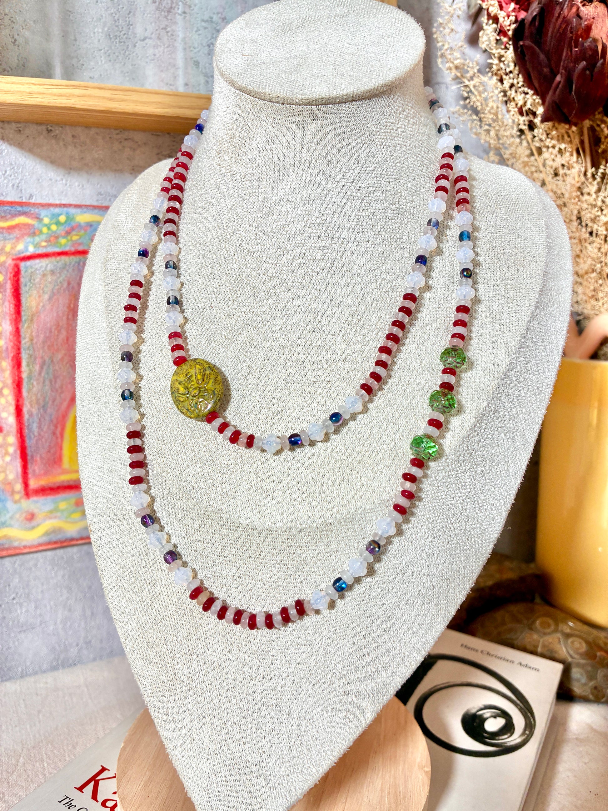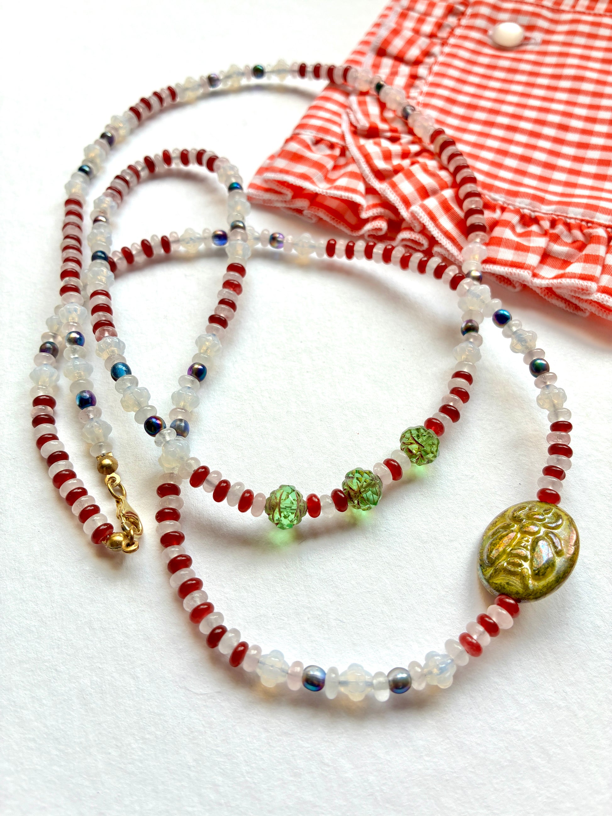 Composé de perles de verre, de quartz rose et de calcédoine rouge, ce sautoir allie délicatesse et caractère.