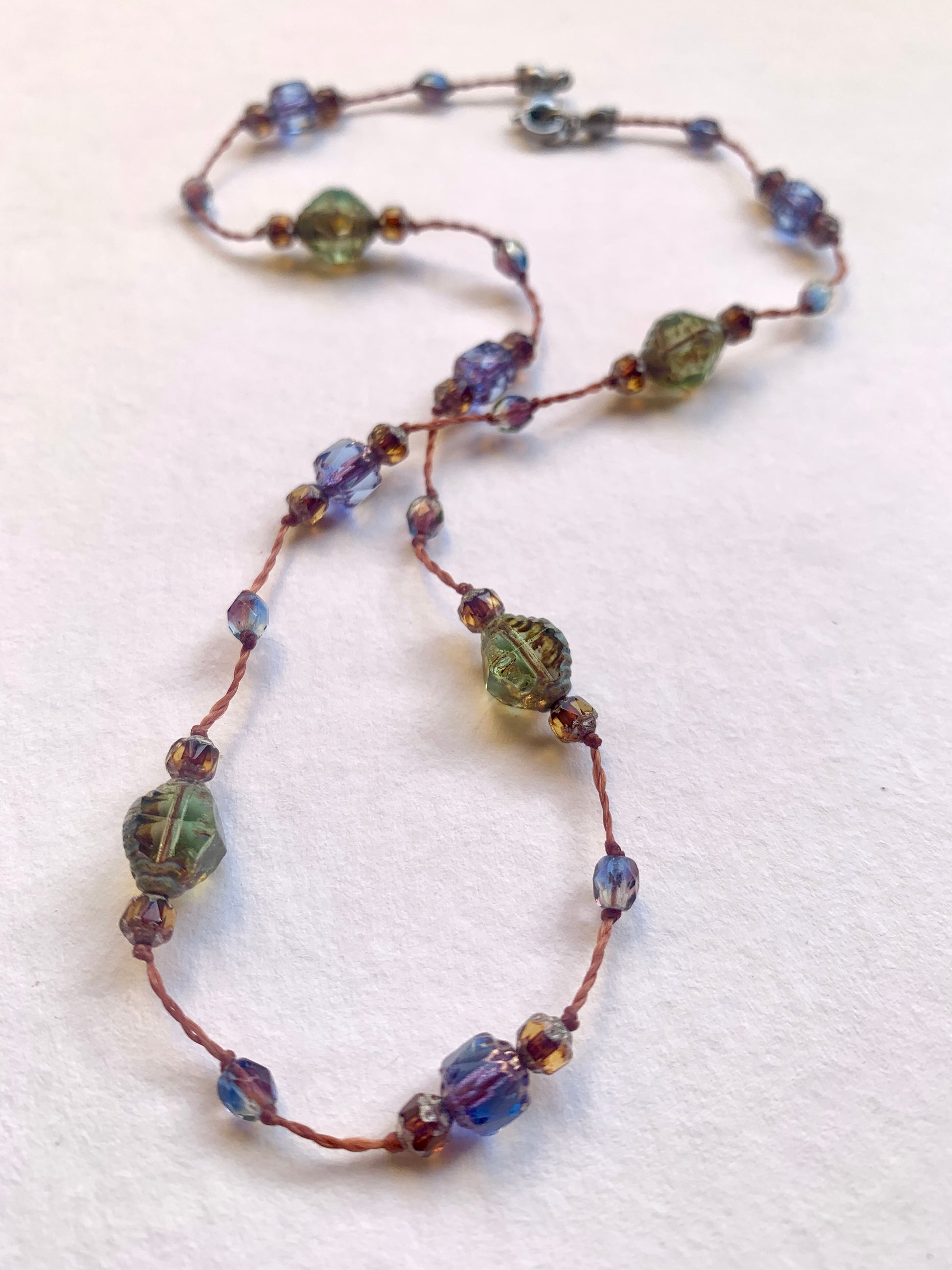 Né des roches ocres et des eaux profondes de la calanque de Figuerolles, ce bijou mêle de délicates perles de verre tchèques aux reflets changeants. Chaque perle capte la lumière comme un éclat de mer, tandis que les nuances vertes et bleutées évoquent les parois minérales baignées de soleil.