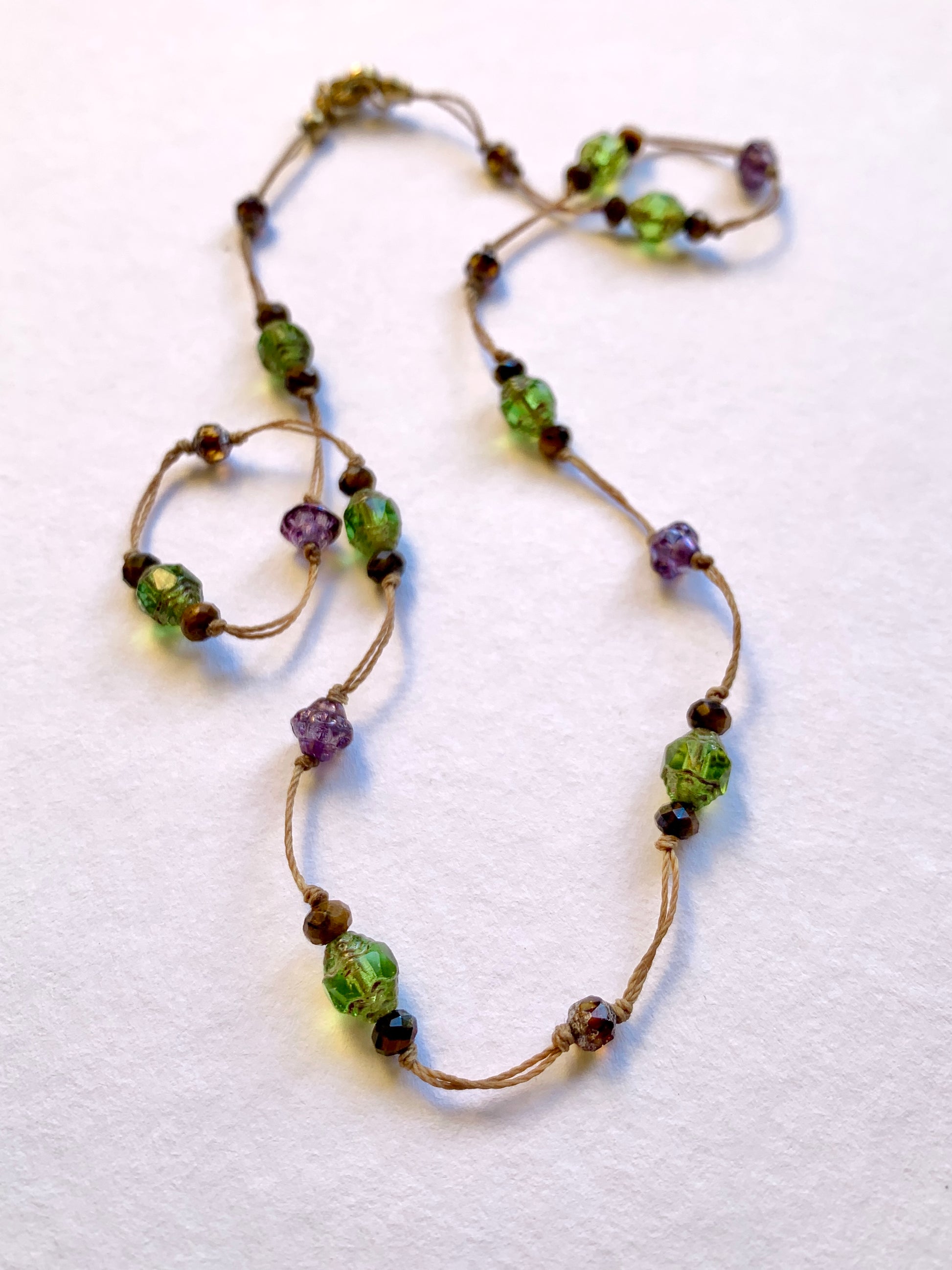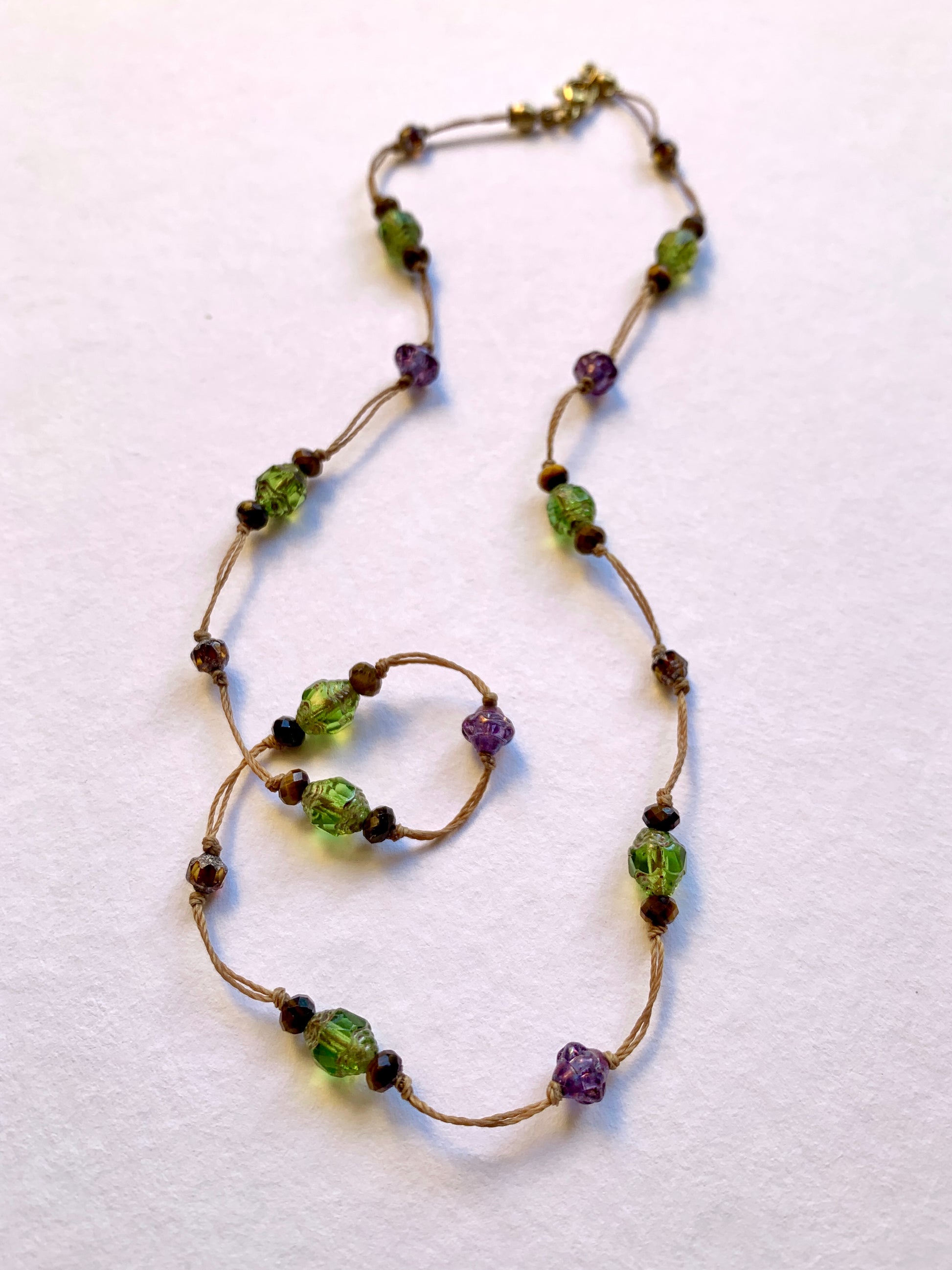 Entre ombre et soleil, Secret des Vignes mêle le vert profond des perles de verre à la chaleur dorée de l’œil de tigre.