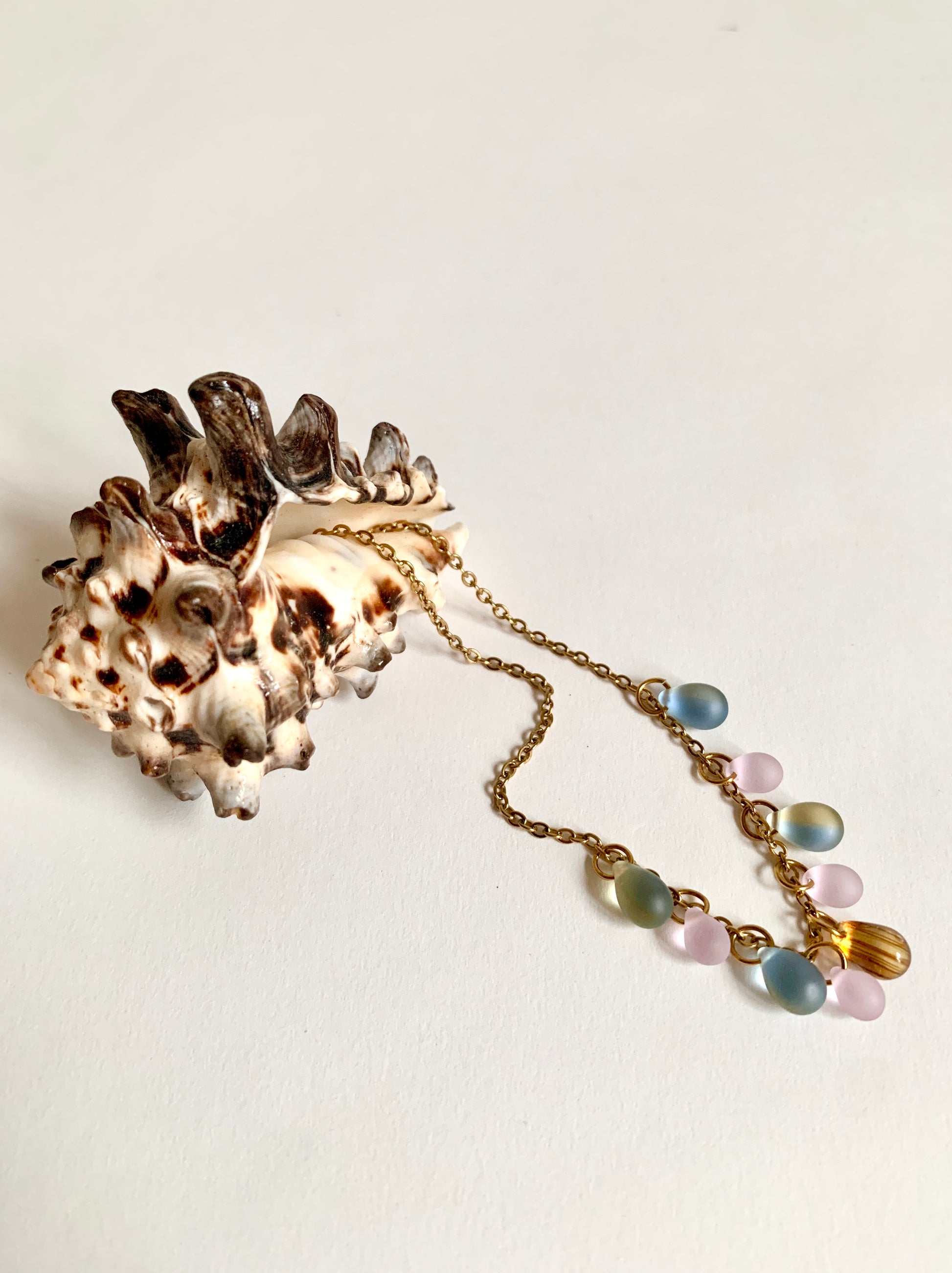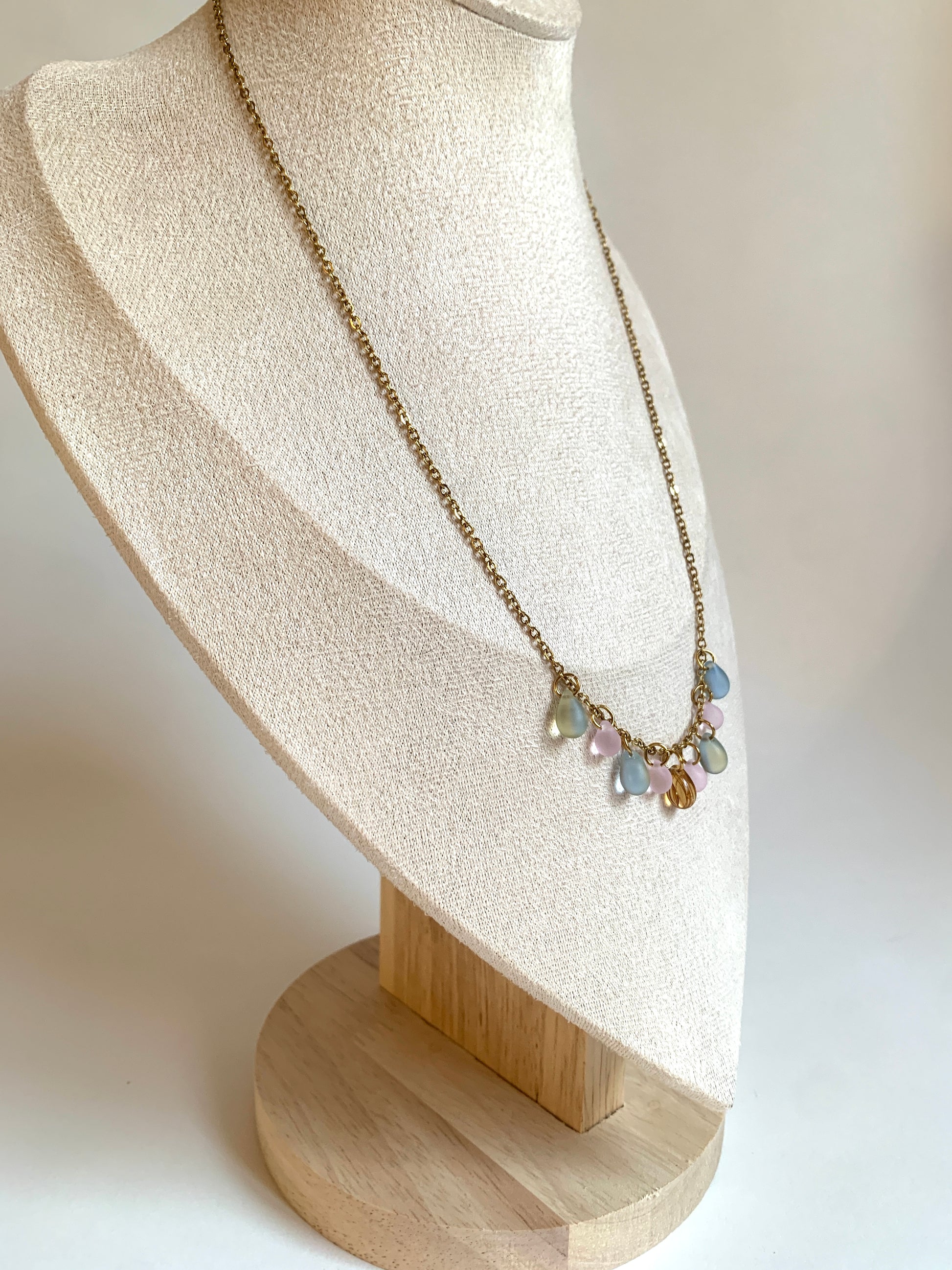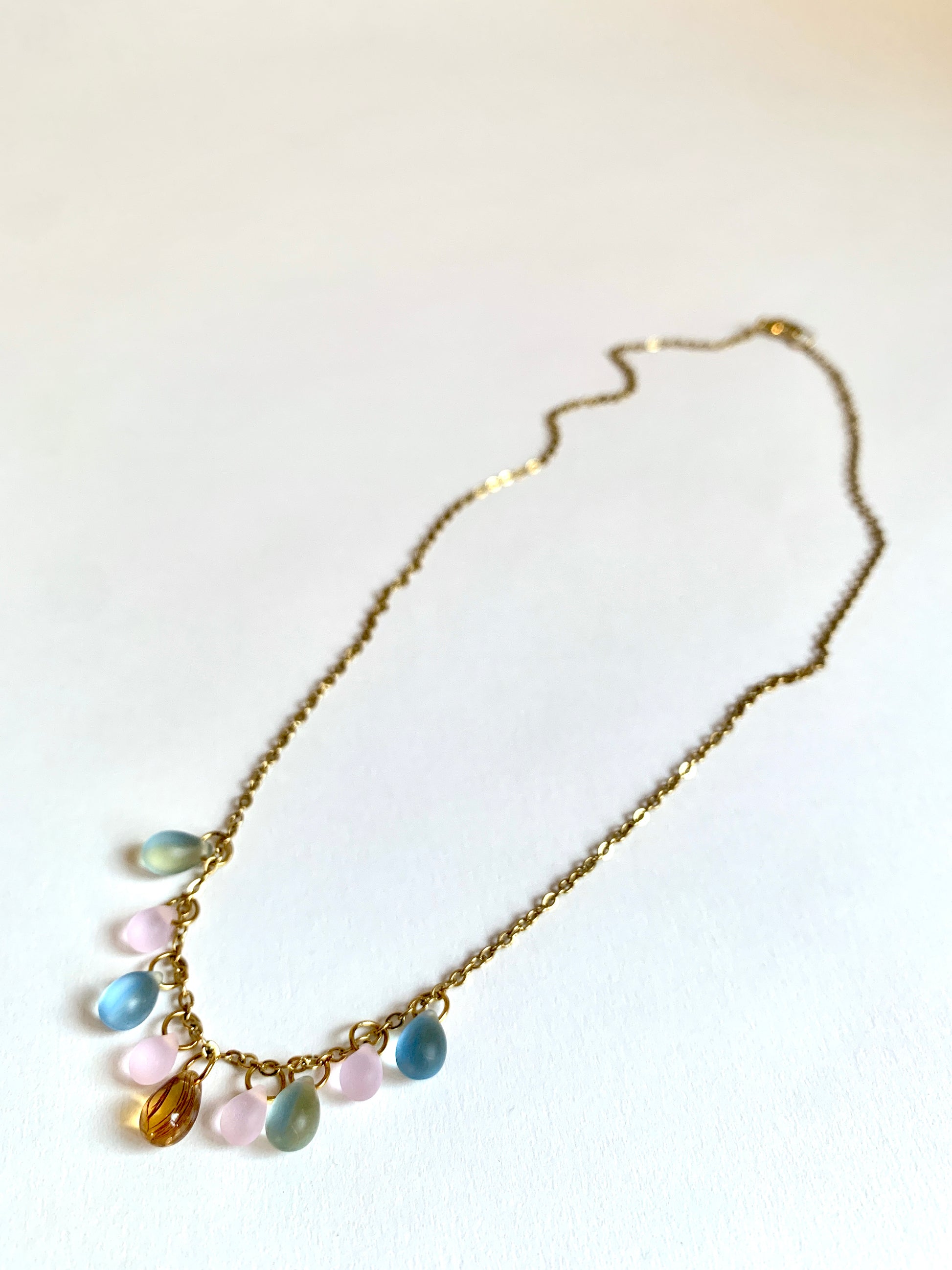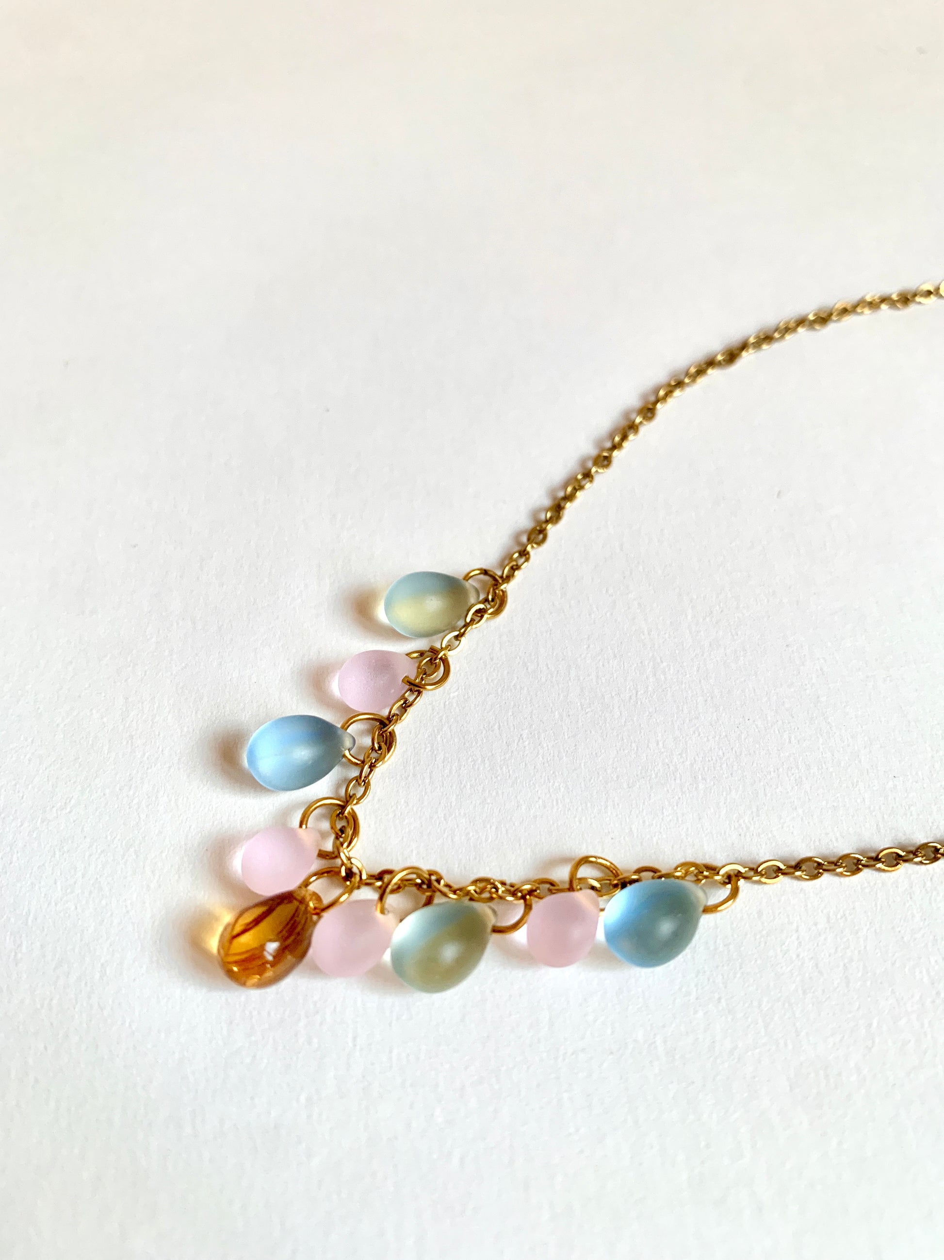Perles de verre montées sur une chaine en acier inoxydable.