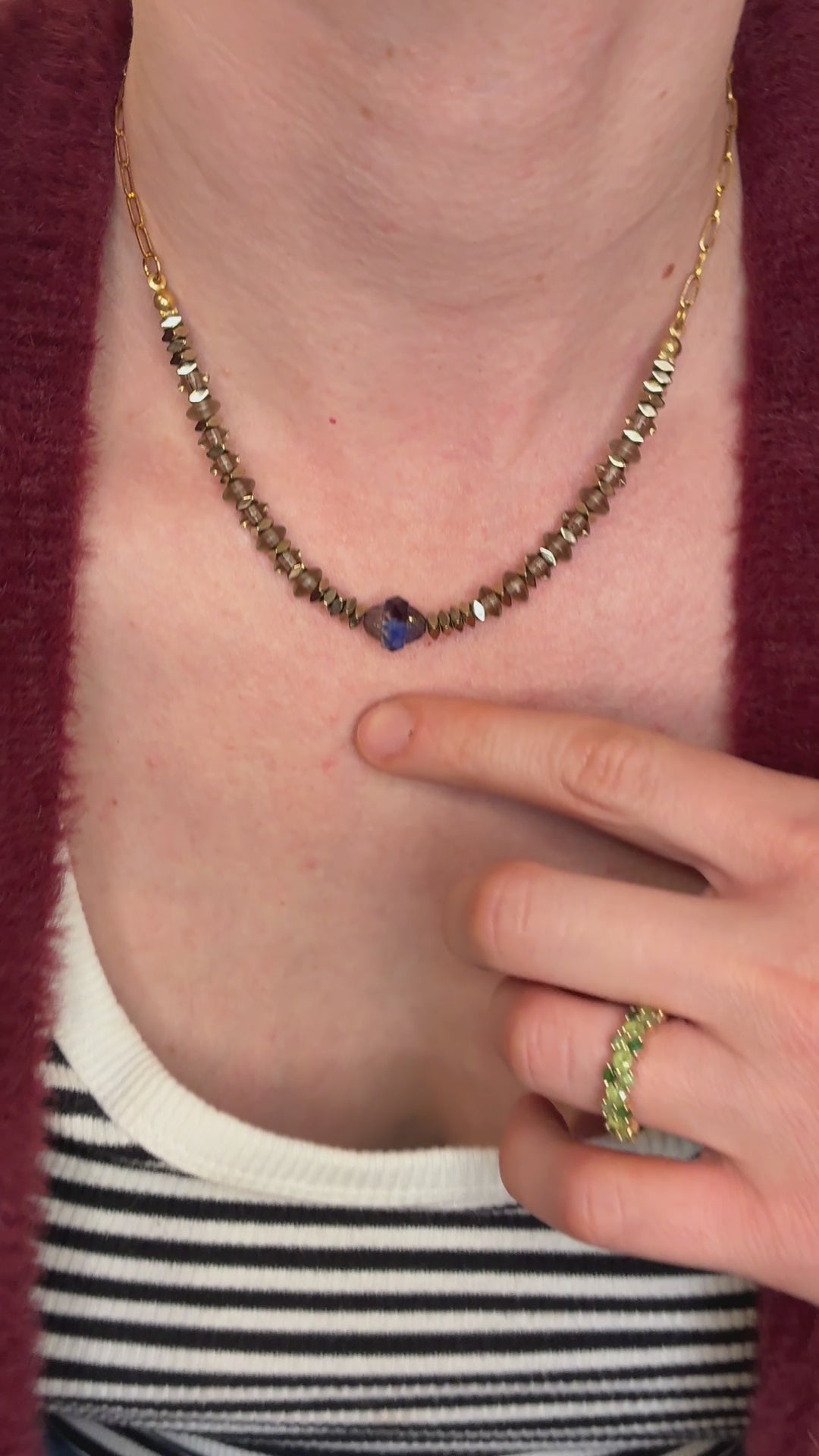 Quartz fumé, Hématites dorées et perle de verre centrale.