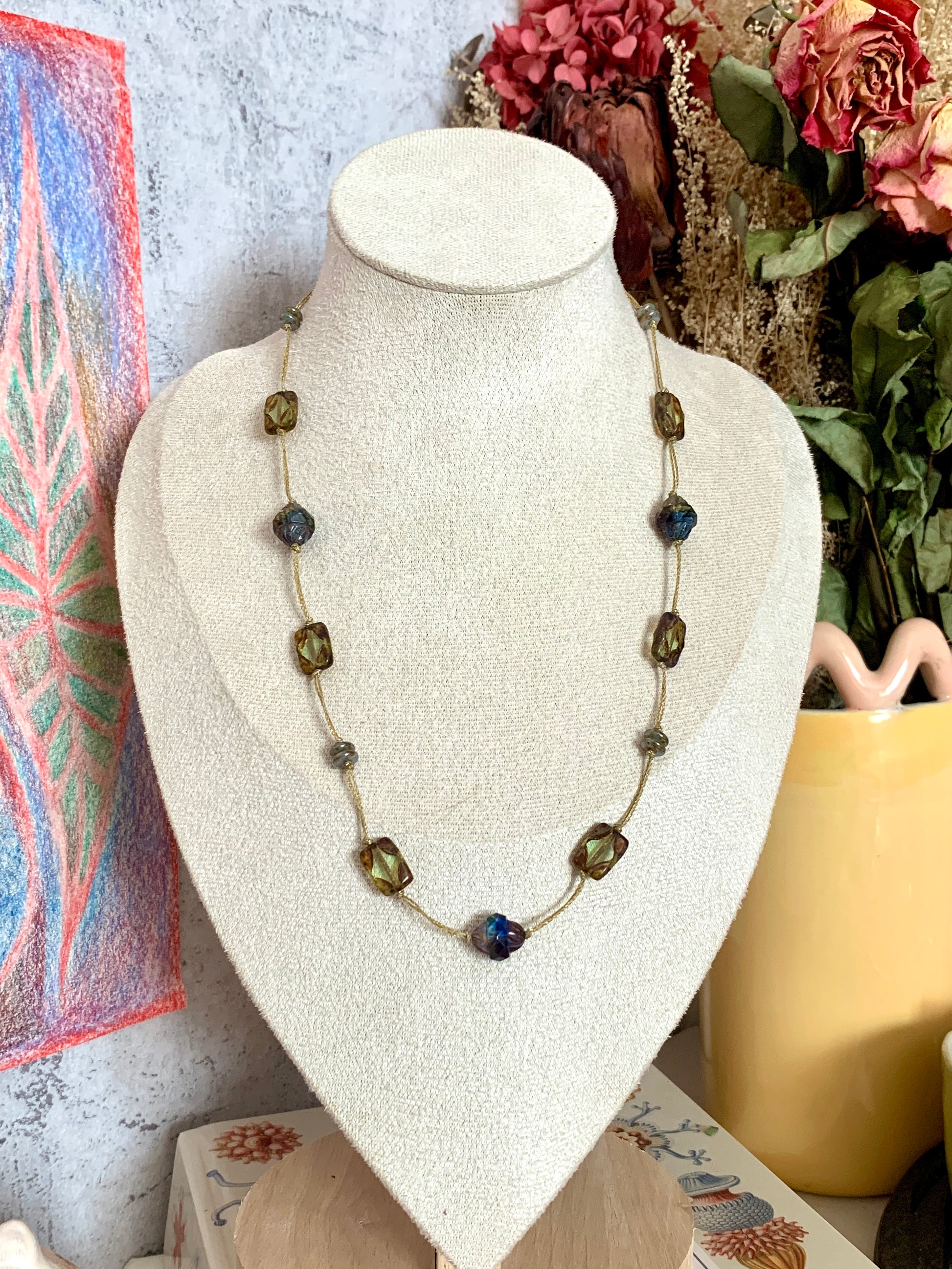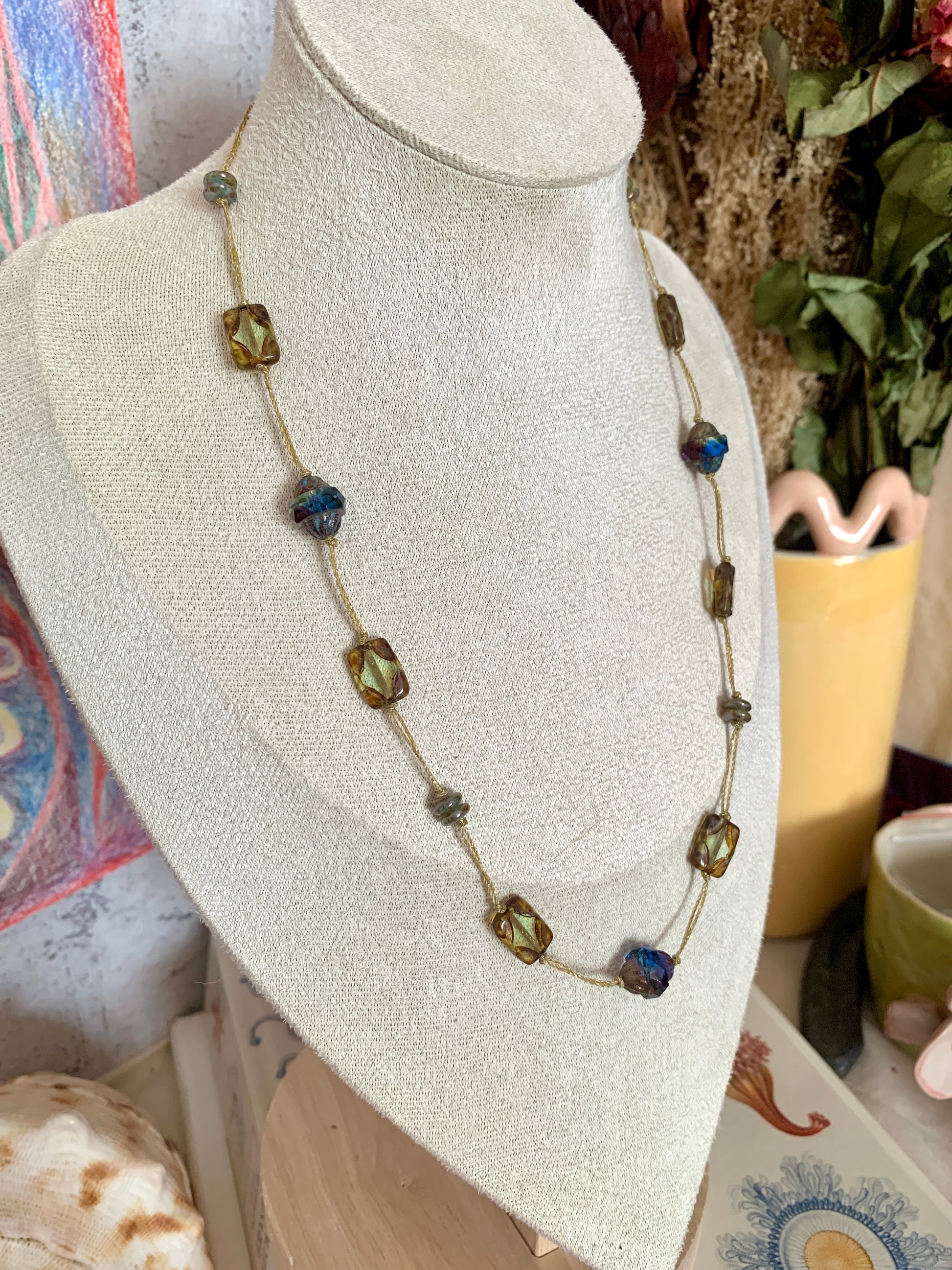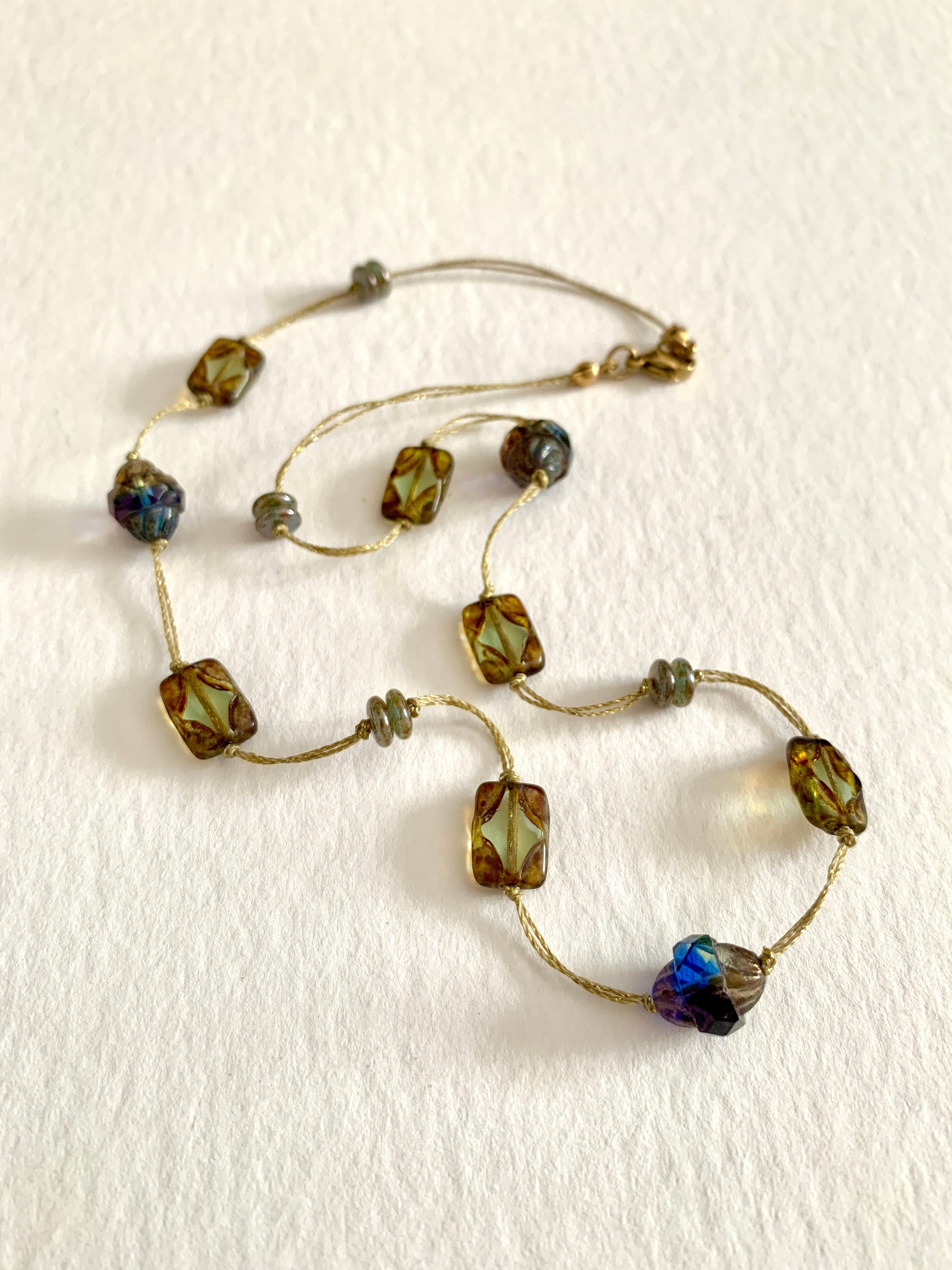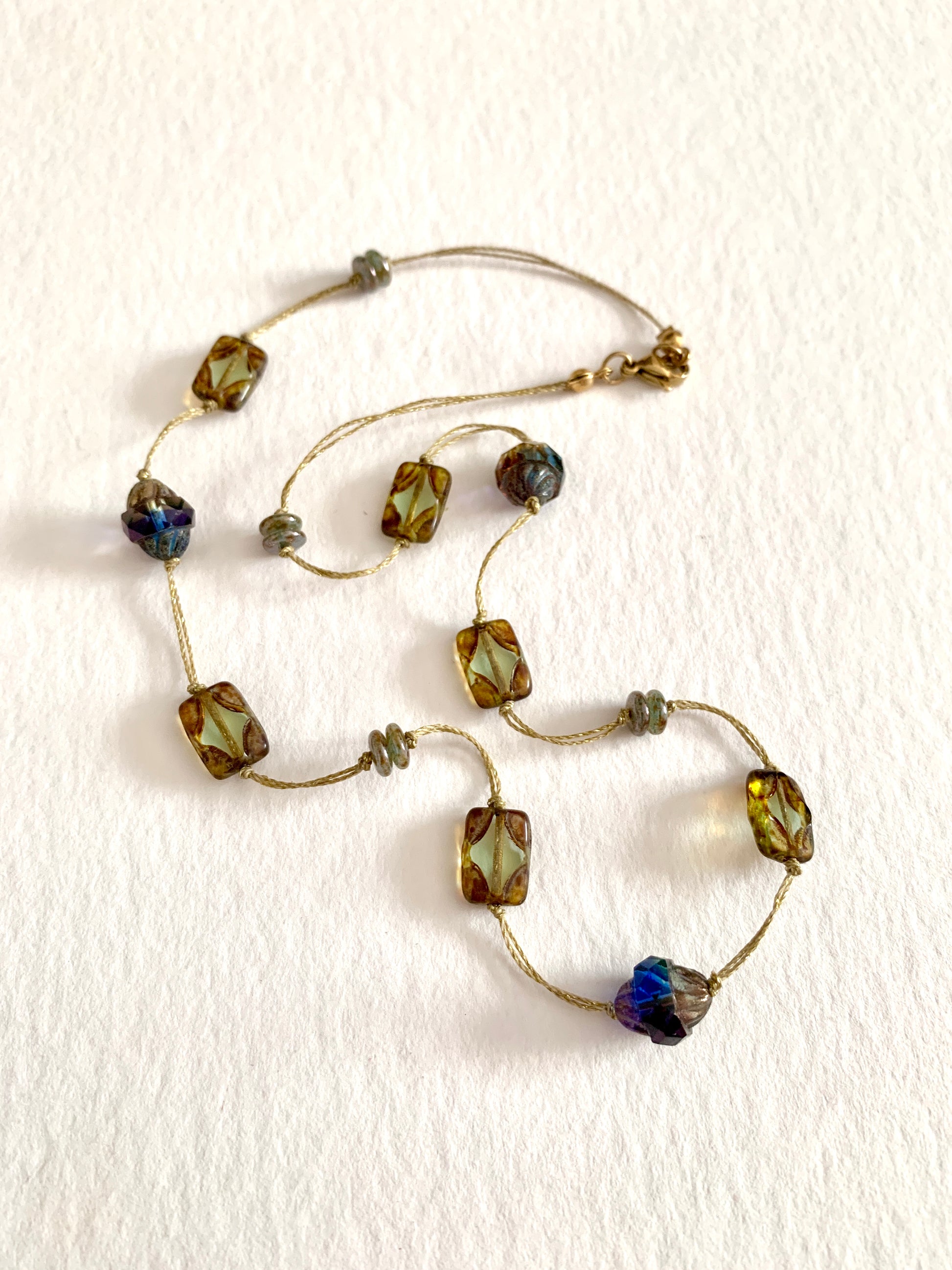 Ce collier, entièrement composé de perles de verre, capture la lumière comme un vitrail ancien. Chaque perle révèle des nuances de vert, d’or et d’iridescence, évoquant les paysages changeants que l’on traverse en voyage. Monté sur une corde légère et discrète, il conserve l’authenticité des bijoux nomades, ces talismans que l’on emporte partout avec soi.